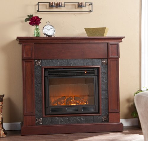 This handsome cherry electric fireplace is ideal for enhancing your home's cozy appeal. With such a commanding presence this electric fireplace is sure to grab the attention of everyone who enters your home. The mantel has faux slate tiles framing the firebox and is made complete by corner embossed metal tiles to give a unique flair to the Lungarno Electric Fireplace. Portability and ease of assembly are just two of the reasons why our electric fireplace mantels are perfect for your home. Requiring no electrician or contractor for installation allows instant remodeling without the usual mess or expense. In addition to your living room or bedroom, try moving this electric fireplace to your dining room for romantic dinners or complement your media room with a ventless fireplace below your flat screen television. Use this great functional electric fire place to make your home a more welcoming environment.